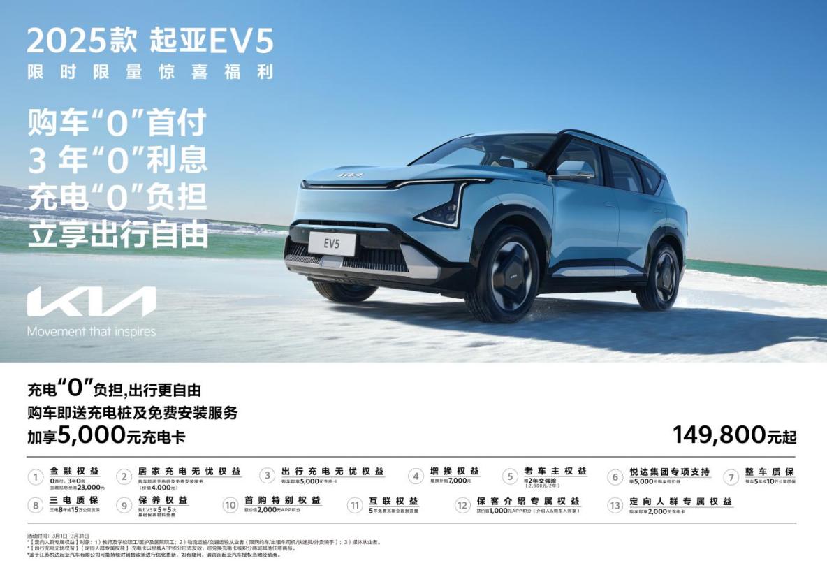 起亚EV5是起亚首款在中国首发、在盐城智能智造工厂生产并销往全球的重磅战略车型,凭借高效可靠的三电系统、同级超长续航里程、灵活实用的百变空间、越级智能科技配置、舒适环保的健康座舱等优势,起亚EV5深受全球用户认可,现已出口至澳大利亚、新西兰、智利、哥伦比亚等全球主流市场。值得关注的是,2025款EV5增配不加价,起售价为149,800元,且综合优惠最高可达5.1万元,堪称“最具质价比的合资SUV”。